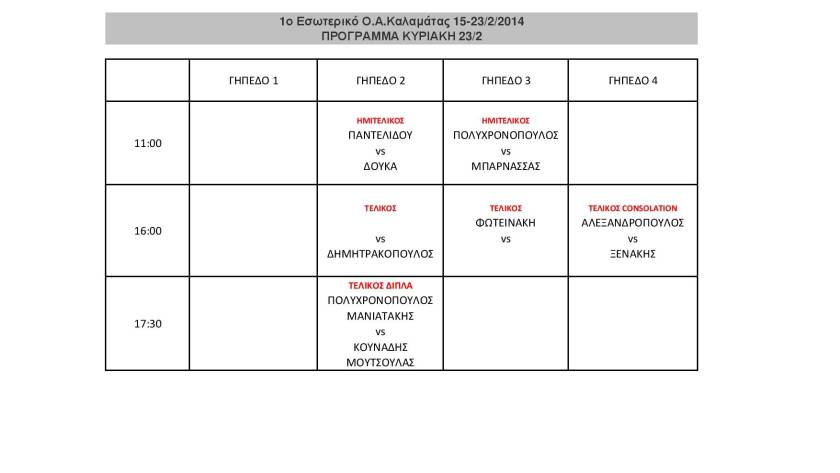 Αύριο Κυριακή ολοκληρώνεται το πρώτο εσωτερικό τουρνουά του ομίλου για το 2014. Στις 4μμ γίνονται οι τελικοί σε όλες τις κατηγορίες στα μονά ενώ θα ακολουθήσει ο τελικός στα διπλά…
