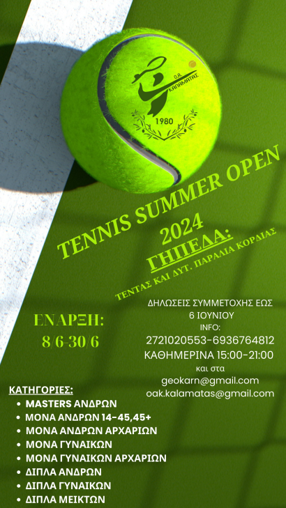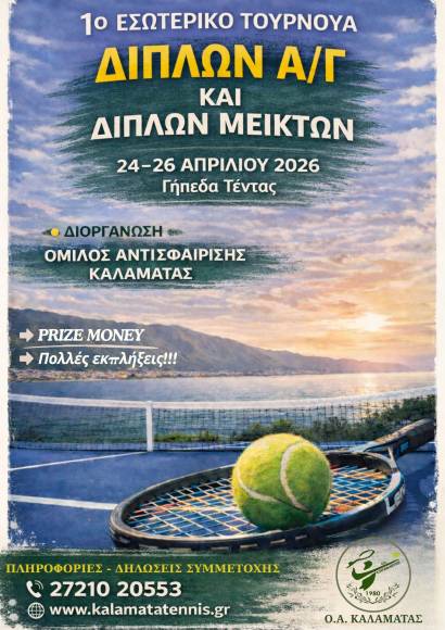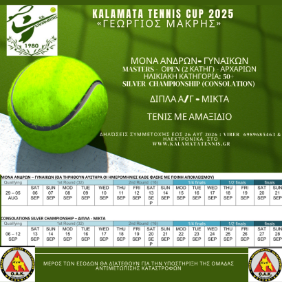 ΤΑ ΝΕΑ ΜΑΣ, Χωρίς κατηγορία27 Αυγούστου 2025KALAMATA TENNIS CUP 2025 «ΓΕΩΡΓΙΟΣ ΜΑΚΡΗΣ» – ΠΡΟΓΡΑΜΜΑ – ΑΠΟΤΕΛΕΣΜΑΤΑ